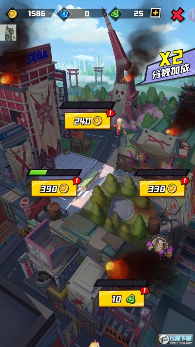 2、现在,他们的士兵在城中到处破坏。忍者君,请用你高超的战斗刀法、百发百中的手里剑和你们神秘的忍术,将他们一一揍飞,为我的子民复仇!玩家能够击杀敌方士兵和在特定区域使用忍术。