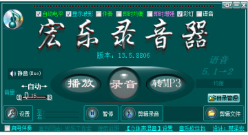 宏乐录音棚顾名思义就可以知道是一款可用于现场录音、任意设置混响参数(添加回音)、转换为MP3等等。是一款是使用简单,当功能上丝毫不逊色于专业软件的录音工具。宏乐录音棚简单的界面,使初学者可以很快上手。《宏乐录音棚》软件可用于现场录音、任意设置混响参数(添加回音)、可录制或剪辑音频信号;可即时或后期均衡、混响、音色增强;可变速变调、后期混音、转MP3等等。