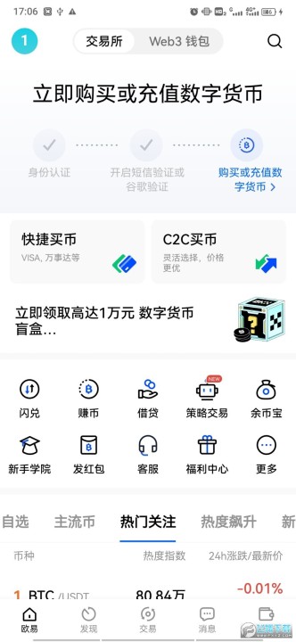 1、首先先下载一个手机欧易交易所,打开欧易OKX手机端APP,点击页面下方法币按钮,即可进入法币交易区,选择快捷区,我要买,选择要购买的币种,输入需要购买的金额,或者要买的币种数量,点击立即购买。