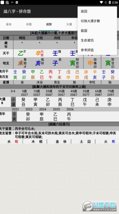 论八字Calc8Words是一个计算八字的算命软体。根据输入的西历时间,排出命主的八字资讯,大运,小运,流年,空亡,胎息,胎元,命宫及五行信息等;细盘功能(四柱,当前大运,当年和明年流年盘);二十八宿信息。