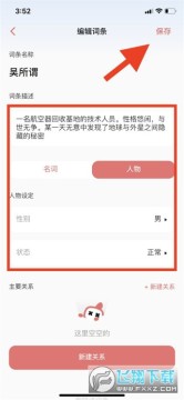 5、这里,你可以开始添加故事里的主要角色和物体,包括,名称,性别,关系等等;写完后点击保存;如果想要某一人物在故事中领便当,可以更改人物状态;