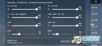 4、陀螺仪灵敏度:第三人称不开镜:400%;第一人称不开镜:400%;红点、全息、机瞄、侧面瞄准镜:400%;2倍镜、win94、p90、猎弓:400%3倍镜:400%;4倍镜、vss:400%;6倍镜:120%;8倍镜:82%