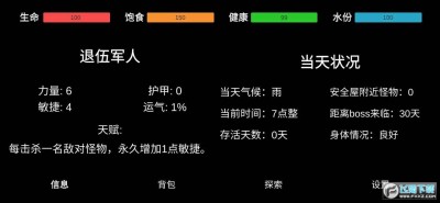 拾荒、末日、生存、探索为一体,游戏全过程只有一条命,每三十天一个阶段,每阶段都会生成boss主动找上你,生存达人们能否渡过重重难关呢?介绍一下这个世界的规则(在游戏内的设置中有备忘录,打开备忘录也可以看到)。