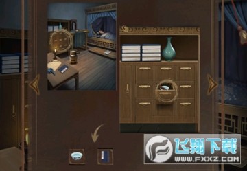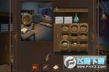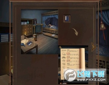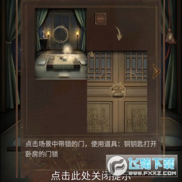1、点击场景中带锁的门,使用道具: 铜钥匙打开卧房的门锁。
