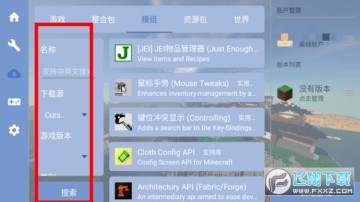 2、同样的就是模组下载,支持中文英文搜索,可以按下载源,游戏版本,类型等等进行挑选