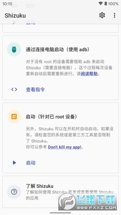 未 root 设备:遵照 Shizuku app 中的指引,通过 adb 启动服务。使用 adb 并不难,网络上有不少教程可以帮助您学会使用它。