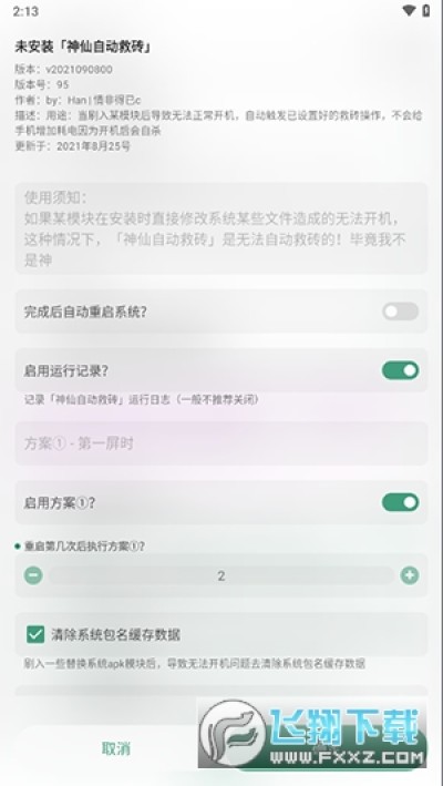 当刷入一些模块后导致无法正常开机时,触发已设置的自动救砖操作方式:在已成功开机后发现屏幕DP和分辨率不正常时自动恢复默认,检测到系统U被冻结时自动启用后重启手机,检测系统界面U进程不存在时,开始禁用所有模块后重启。