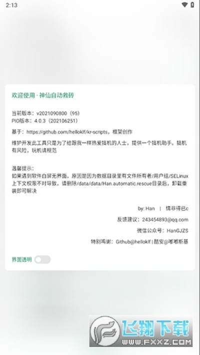 如果遇到软件白屏无界面,原因是因为数据目录里有文件所有者/用户组/SELinux上下文权限不对导致,请删除/data/data/Han.automatic.rescue目录后,卸载重装即可解决。