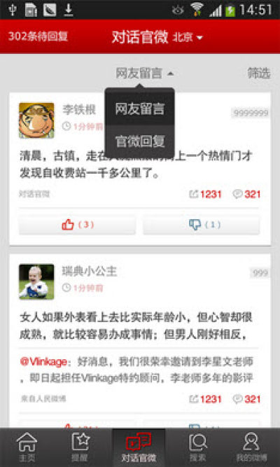 民意通:网友与官方微博直接对话工具,不出门反映身边难题,几万政府机构网上办公。