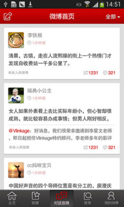 这是人民微博的手机客户端,用户朋友们可以在这里发微博和发评论,和其它人一起分享自己的生活与心情,同时对于自己感兴趣的话题,大家都可以参与其中和政界名人一起互动,感兴趣的朋友快加入进来吧!