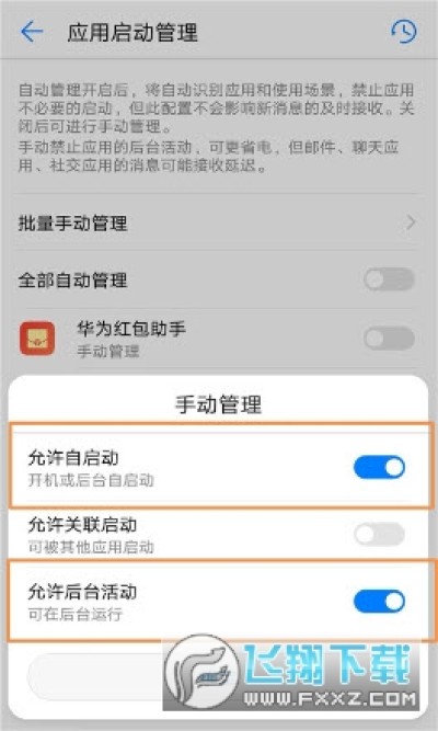 3.打开华为红包助手app,并开启开机自动运行和允许后台运行的权限;