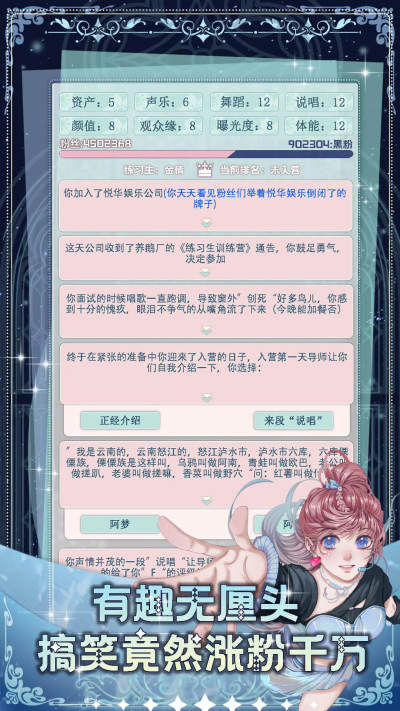 《重生顶流练习生》是一款关于选秀的休闲文字游戏,单机简单好上手,在游戏中她将手撕绿茶女二,脚踢普信富二代,与节目组斗智斗勇,和集美一起过五关斩六将,最后成功C位出道,走向属于她的闪耀星途。