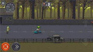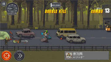 4、在废弃的汽车之间转弯,开过僵尸,当僵尸靠近时以最快的速度射击,去车库升级你的车和枪,并保持速度。