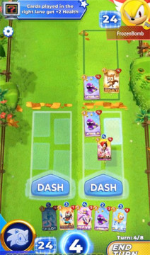 6、在自己的回合点击DASH按钮可以让对应一边的卡牌进行攻击,如果此时对面也发动进攻,就会互撞抵消,没有就会给对面直接造成伤害。
