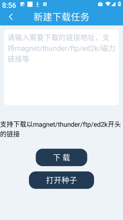 3、然后输入需要下载的链接,支持magnet/thunder/ftp/ed2k/磁力链接等。