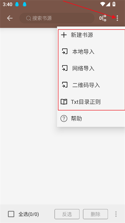 4、在新建书源页面,你可以选择不同的导入方式,如本地导入、网络导入、二维码导入。根据你的需求选择合适的方式。