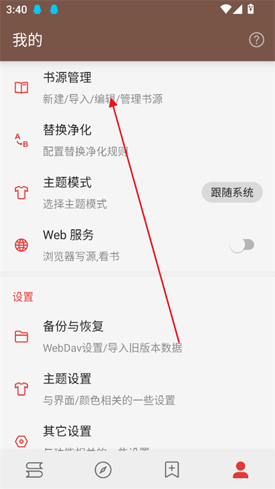 2、在首页上,点击右上角的人像图标,然后点击【书源管理】。