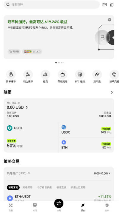 提供 活期、定期、质押 等多种“赚币”方式,年化收益可观。