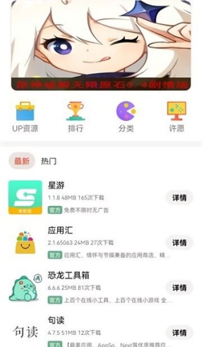 1、打开app首页,提供up资源,游戏,排行,视频等多个板块的内容。