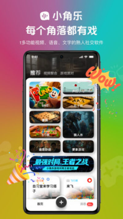 “小角乐”— 超好玩视频游戏派对,一个多功能视频、语音、文字的熟人社交软件,在这里,实时视频互动是我们的核心亮点。无论是和三五好友来一场多人视频聚会,分享生活趣事;或一起组局畅玩数十款热门互动游戏,和好友斗智斗勇,在推理与谎言中感受刺激;还是进入自习室,和志同道合的伙伴一起专注学习;亦或是开启教学视频聊天,向他人请教知识、技能,又或者召开一场高效的线上会议,“小角乐” 都能满足你。