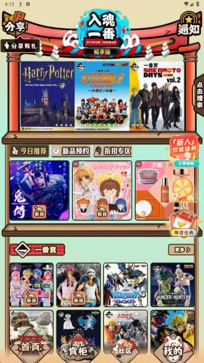 作为聚焦动漫周边领域的特色平台,入魂一番赏精准解决了动漫爱好者 “正版周边难寻、收藏体验单一” 的痛点。平台以 “正版商品 + 一番赏玩法” 为核心特色,一方面整合全球热门动漫 IP 资源,从经典动漫角色手办到限定款摆件,全方位覆盖收藏需求;另一方面打破传统购物模式,引入充满刺激感的一番赏抽奖机制,模拟盲盒与扭蛋的未知惊喜感。其核心优势在于 “正版保障与趣味体验”—— 官方认证确保商品正品,杜绝劣质仿品;一番赏玩法让选购过程充满乐趣,不仅满足收藏需求,更带来 “抽赏中好礼” 的快感,全方位提升动漫周边选购与收藏的体验感。