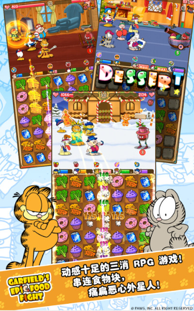 《加菲猫的史诗食物大战 Garfields Epic Food Fight》是一款动感十足的结合了三消与RPG元素的休闲游戏。利用各种绝招和连击技能串连食物块,痛击可恶的外星人并获得最后的胜利吧!喜欢加菲猫系列游戏的小伙伴们千万不能错过哦!
