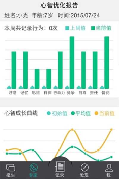 1、它就像一个医院体检报告,记录孩子的行为,形成心智优化报告,孩子的心智情况(注意、记忆、思维、自律、行动力、竞争、自尊、责任、情商)一目了然。每天记录孩子的情况,7天形成一份报告。