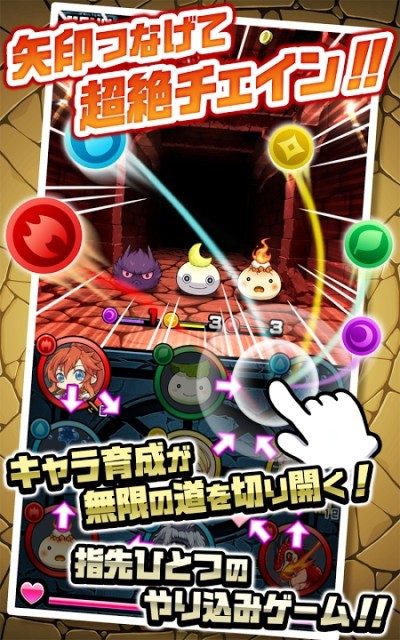 游戏的玩法相当简单,玩家只要顺著画面下方的箭头指示进行串连,就能轻松地享受到战斗的乐趣。并且随着队伍角色的组合不同,箭头数量也会随之改变,玩家还可以通过技能、连锁或道具等组合来改变战况,享受单纯却又富有丰富战略性的游戏乐趣。