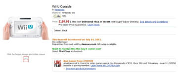 国外网络购物平台亚马逊经常提前公布一些游戏和新主机的发售日和预售价格,这使很多玩家津津乐道。现如今任天堂还没有公布WiiU的发售日和售价,英国亚马逊网站放出WiiU主机的预购,预购页面现实发售日期为2012年7月14日,售价为200英镑,折合人名币2000元左右,但预购页面只可以选择黑色主机。