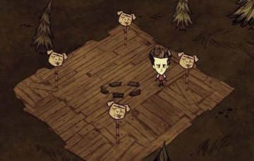 周围四个猪头可以用锤子敲掉,掉落2树枝2猪皮