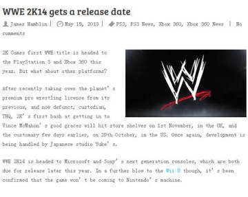 由2K Sports工作室打造的最新美国职业摔跤系列即将推出新作《WWE 2K14》,其正式发售日也在近日决定,PS3和XBOX360版本游戏预定将于2013年10月29日登陆北美地区,11月1日登陆英国地区,而PS4和XBOX720版本也在开发中,发售日期目前未明,不过预计将于今年晚些时候发售。另外官方证实这款游戏不会登陆任天堂WiiU平台。