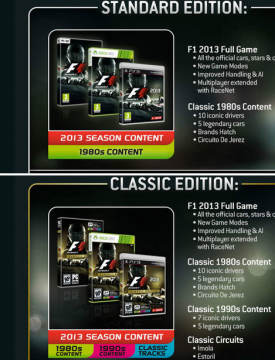 《F1 2013》标准版将收录经典的1980赛季内容,其中包括10名传奇赛车手,5辆经典赛车等内容,而经典版除了包含标准版内容外,还将收录1990赛季内容,这其中有7名传奇赛车手,5辆经典赛车等,敬请期待。
