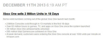 ·在销售高峰时,消费者每一分钟便从亚马逊商店买走超过1000台Xbox One