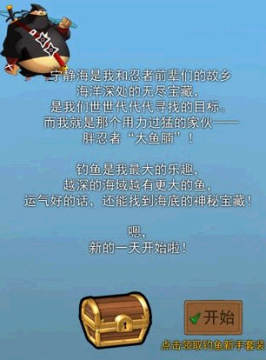 首先,你会看到胖忍者“大鱼腩”坐在一个小船上。不要小看这个不起眼的破旧小船,它可是大鱼腩家世代相传的宝贝呢。