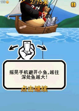 接下来轻点屏幕,将鱼线放入大海,然后倾斜你的iPhone/iPad,躲开那些体型较小的鱼,尽可能地到达海底的最深处。(为什么呢?因为深海的鱼更大,而且海底还有宝藏呢!~)
