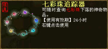 | 消耗与用途 | 消耗:黄宝石*10 用途:用于镶嵌强化值为15-19的装备。 | 消耗:50通宝 用途:追踪七彩珠(七彩珠玩法)下落 |