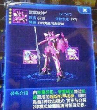 雷霆战神Y由异形+曙光合成,可以进行分裂、贯穿的攻击,并且两种攻击模式的能量圈可以进行切换,特技是日烈贯射/暗影裂刺,lv75攻击6718,分数加成89%,看起来还是挺不错的。
