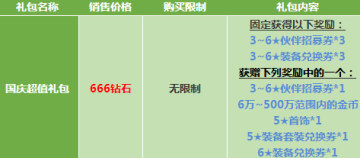 活动期间,商城中的“幸运广场”将会上架新商品“国庆超值礼包”,包含丰厚的超值内容,无论是迅速增强实力,还是着眼投资未来,都是非常划算的!限期销售7天,不限购买次数!