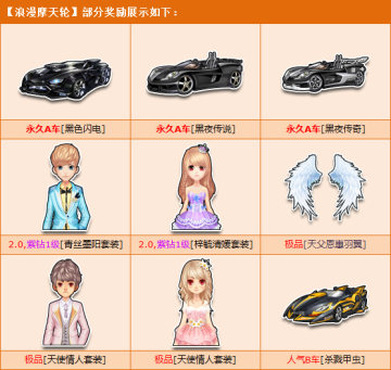 金秋超低价回馈,10月15日上午11点起-11月24日,仅需3.6Q币在商城购买“浪漫摩天轮”,开启就有机会获得永久A车(黑色闪电/黑夜传说/黑夜传奇)、极品套装、极品翅膀或其他奖励之一。