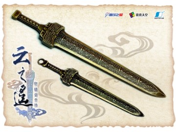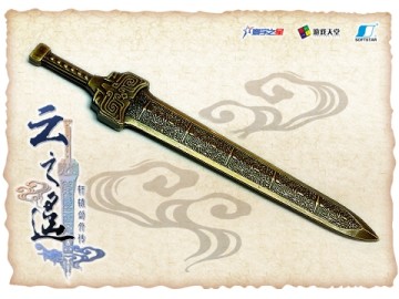 全剑14 cm,其中剑首0.5cm ,剑身9.9cm,剑柄3.6cm。第二:包装不同豪华版轩辕剑,独立包装,配有专门剑匣,标准版并无剑匣。轩辕剑,神州上古十大神器之一,是一把闪耀着金色光芒之上古神剑,其内蕴藏无穷之力。传说此剑乃天界诸神给予黄帝以击败蚩尤,也有传说认为此剑乃黄帝所自铸造;在历史上的许多动乱时代,都曾见到它活泼的踪迹…… 一把轩辕剑,引出了10部轩辕剑作品,陪伴玩家度过了20年,具有极高的收藏价值云之遥。因此在本次《云之遥》简体版推出的两个版本中都有安排,以保证大家都有一把属于自己的“轩辕剑”。