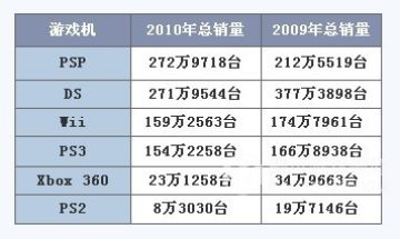 在所有游戏机中,只有PSP今年销量相比2009年有所增长,其总销量达到了2,729,718台,比去年的2,125,519台多卖了60万;DS排在第二,卖出2,719,544台,但是相比去年下降了100万;Wii位居第三,销量1,592,563台游戏市场,游戏。