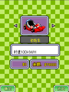 选择角色后进入赛车选择菜单,一开始只能开初始车,可以通过比赛获取奖金的方式挣钱购买其它三种型号的赛车。