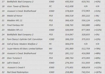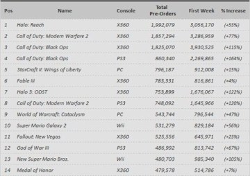 下面这个榜单就是2009年-2010年美国游戏预购榜前50名单,以及这些游戏的首周销量。