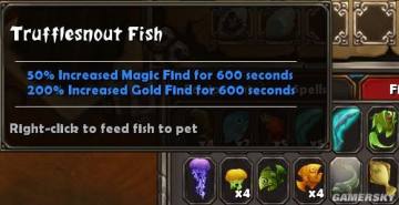前面卖了个关子,关于Fishing luck。钓鱼看起来很鸡肋,钓些鱼给BB吃,变个外形,不管变多厉害,BB最终是个辅助,撑死变成BOSS也不过是玩家们的手下败将。但是钓鱼可以钓出很多从别的地方无法得到的东西!除了短时间加抗性加元素伤害的鱼(给人吃的)之外,还有加跑速加护甲加格挡的,这些东西平时可能打小怪都来不及想到去用,但是BOSS战前吃一个还是很不错的。最为怨念最为强大的存在莫过于:
