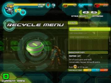 老实说本作的难度虽然不比洛克人,但还是蛮高的高,在第二关开始你就可以得到关卡选择的能力。让你给你重新进入这一关开始战斗,这个不仅可以让你挑衅更高的战斗评价也让你能够更加放心的赚取零件,举行武器升级。在获得你想要的零件数量后再次选择其他关卡便可以生存当前的零件数量以及提升的物品级别。因此着实打不过去就回到以前的关卡升级物品之后再实验挑衅吧。