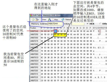 11 谁数值的下面一行即是背包总空间的地址(共4个字节,黄色配景是修改后表现的)。将想要的数值转成16进制后填入此处。用WINDOWS自带盘算器即可转换,利用科学型。假假想要1000背包空间,16进制为03E8,在适才的地址按次序输入E8 03后,回游戏,买卖一下东西,让已用空间转变一下,背包总空间即会变成1000,如下图。
