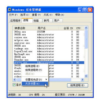 alt+tab切换出游戏,打开任务管理器,找到进程gta-vc.exe,然后鼠标右键单击它,选择关系设置(如下图)。