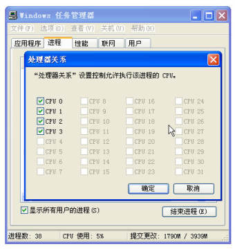 进到关系设置中以后我们会看到你的这个进程由多少个CPU在处理着。你的CUP是几核的,这里就会有几个钩,就好比小萌现在用的这台机器是4核心,所以这里显示有4个CPU选项被打上了钩(如下图)。