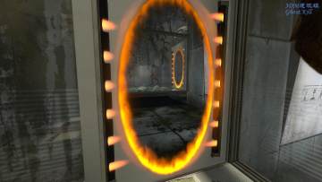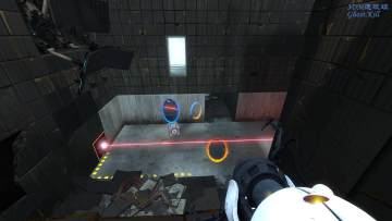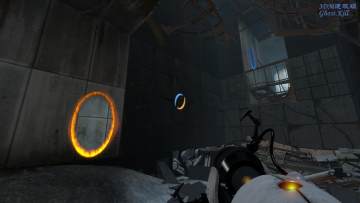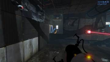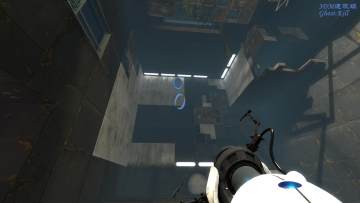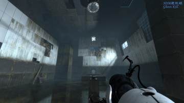 到房间中央后地板塌陷,到下层后通过水路,台阶上有传送门枪,这把枪只能发射蓝色传送门。