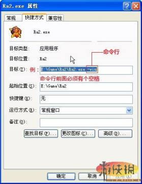 第二步、图示红框中,在游戏路径(即E:\Game\Ra2\Ra2.exe)后加上[空格]+命令列(把-win 替换为您的命令列)。游戏中按以下键位可得到对应效果: